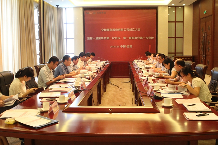 2016年8月18日,安糧期貨股份有限公司創(chuàng)立大會暨第一屆董事會第一次會議、第一屆監(jiān)事會第一次會議在稻香樓賓館徽苑巢湖廳隆重召開。公司股東單位領導及股東代表,安糧期貨經(jīng)營管理層等相關人員出席了會議。大會審議通過了《安糧期貨股份有限公司籌辦情況報告》、《安糧期貨股份有限公司章程》、《安糧期貨股份有限公司股東大會議事規(guī)則》等13個議案,審議通過了安糧期貨股份有限公司第一屆董事會、監(jiān)事會、經(jīng)營管理層人選。