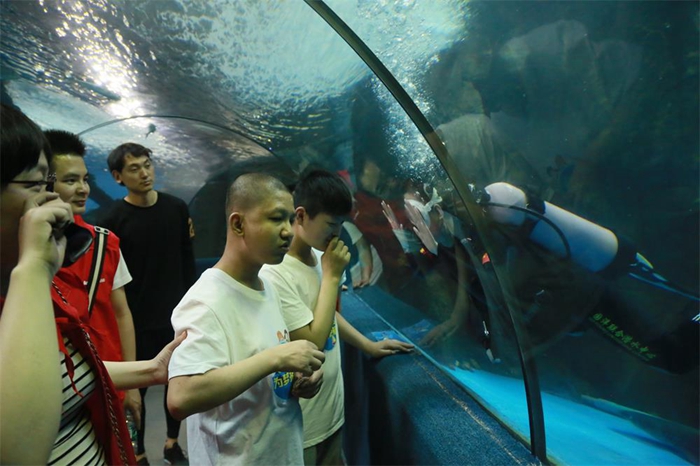 見面會結(jié)束后,志愿者們與小朋友手牽手,乘車來到合肥海洋館。珊瑚、魚兒五彩斑斕,海獅、海豚表演精彩紛呈,小朋友們因為聽力或視力障礙無法完全感受得到,但哥哥姐姐們用愛與陪伴、細心描述讓小朋友“看”到、“聽”到、感受到了世界的美好,純真的笑容背后是一個美麗多彩的世界。結(jié)束海洋館體驗,志愿者們與小朋友共同制作漢堡,共同享受了快樂的午餐。