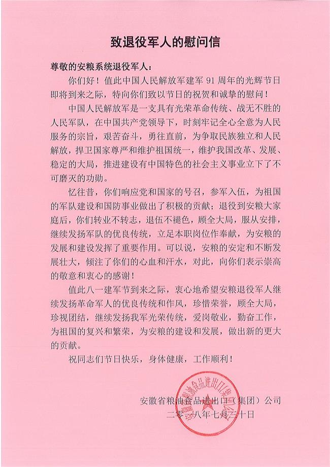 中國(guó)人民解放軍建軍91周年節(jié)日前夕,根據(jù)集團(tuán)黨委的部署,集團(tuán)工會(huì)慰問(wèn)了安糧系統(tǒng)全體退役軍人,向他們送上節(jié)日的問(wèn)候和美好的祝愿!
