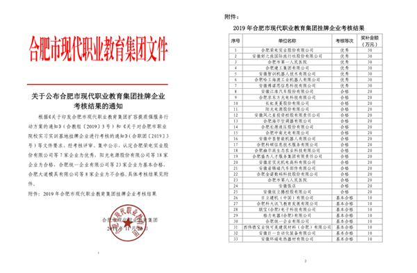 11月26日,合肥市現(xiàn)代職業(yè)教育集團(tuán)掛牌企業(yè)考核結(jié)果揭曉,合肥建工在56家掛牌企業(yè)考核中取得第四名的好成績,考核等級被評為優(yōu)秀的七家企業(yè)之一。這是合肥建工開展校企合作以來,首次考核等級被評為優(yōu)秀,并獲得合肥市政府專項資金獎補。