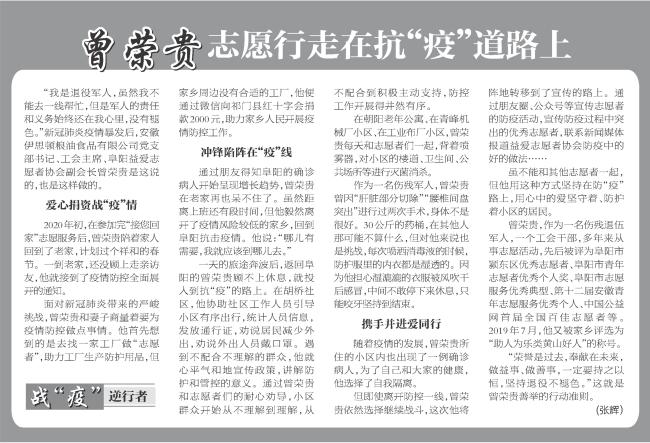 黃山人曾榮貴是安徽伊思頓糧油食品有限公司黨支部書記,他是一名傷殘退伍軍人,擔(dān)任阜陽益愛志愿者協(xié)會(huì)副會(huì)長,曾積極參與過大小百余次公益活動(dòng),被評(píng)選為“助人為樂黃山好人”稱號(hào)。在今年新冠病毒蔓延的特殊時(shí)期,曾榮貴不僅捐資戰(zhàn)“疫”,更沖鋒在前。正月初一,他就協(xié)同當(dāng)?shù)卮鍍晌e極投入到防控疫情一線,白天走進(jìn)村委會(huì)和公共場(chǎng)所開展防疫消毒,幫助村兩委工作人員開展出入人員管控;晚上編輯公眾號(hào)文章,宣傳防疫活動(dòng)和防疫過程中的好做法,用行動(dòng)踐行了共產(chǎn)黨員的初心使命,發(fā)揮了黨員的先鋒模范作用。