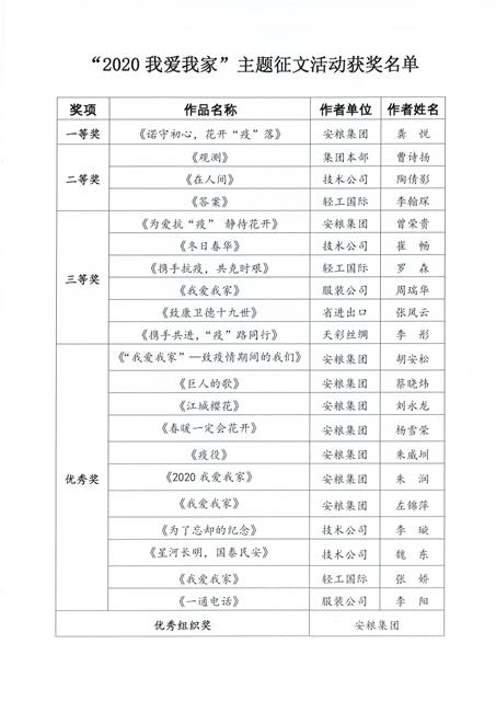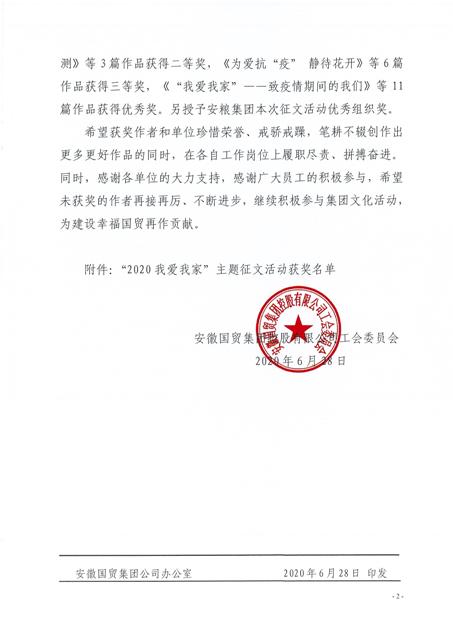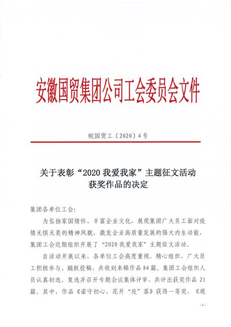 為弘揚(yáng)家國情懷、豐富企業(yè)文化,國貿(mào)集團(tuán)工會組織開展了“2020我愛我家”主題征文活動(dòng)。安糧集團(tuán)工會積極參與,最終斬獲多項(xiàng)獎(jiǎng)項(xiàng),以最佳的姿態(tài)畫上圓滿的句號。