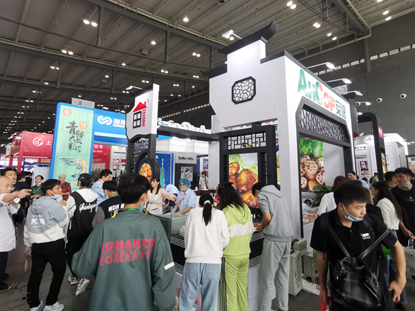 安糧實業(yè)展臺設(shè)計延續(xù)了往年廣受好評的徽派建筑設(shè)計模版,粉墻黛瓦成為一道亮麗的風(fēng)景線。全新設(shè)計的產(chǎn)品宣傳冊高端精致, 黃金薯條、親嘴藕丸等新產(chǎn)品也引起了同行和觀眾的極大興趣,紛紛表示希望在展會結(jié)束后進行深度對接。
