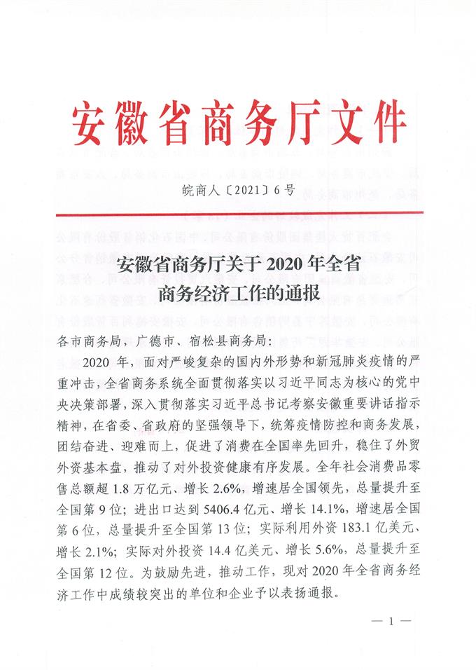 全省商務(wù)工作電視電話會(huì)議2021年1月21日上午在合肥召開。會(huì)上,省商務(wù)廳張箭廳長對2020年全省商務(wù)經(jīng)濟(jì)工作中成績較突出的單位和企業(yè)予以表揚(yáng)通報(bào)。