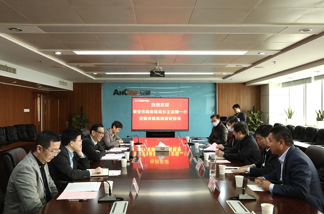 周洪副總裁對王局長一行的到來表示歡迎,并介紹了公司的發(fā)展歷程、業(yè)務(wù)板塊及2020年經(jīng)營情況。王局長簡要介紹了泰安市發(fā)展情況以及當?shù)靥厣a(chǎn)品,提出希望發(fā)揮雙方平臺優(yōu)勢,拓寬與安糧集團的合作空間。雙方與會人員就農(nóng)產(chǎn)品研發(fā)、產(chǎn)業(yè)化建設(shè)及推動當?shù)赝庀蛐徒?jīng)濟發(fā)展等方面展開了深入的交流討論。