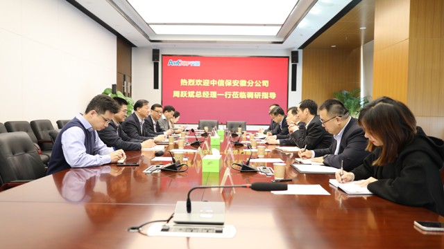3月3日下午,中信保安徽分公司黨委書記、總經(jīng)理周躍斌帶隊(duì)來(lái)公司調(diào)研,曹訓(xùn)立董事長(zhǎng)熱情接待了周躍斌總經(jīng)理一行并舉行調(diào)研座談,周洪、吳國(guó)杰、朱亮及相關(guān)部門負(fù)責(zé)人參加座談會(huì)。