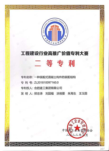 7月29日,中國施工企業(yè)管理協(xié)會公布了“第二屆工程建設行業(yè)高推廣價值專利大賽”評選結果,合肥建工“一種裝配式混凝土構件的裝配結構”發(fā)明專利榮獲大賽二等獎。