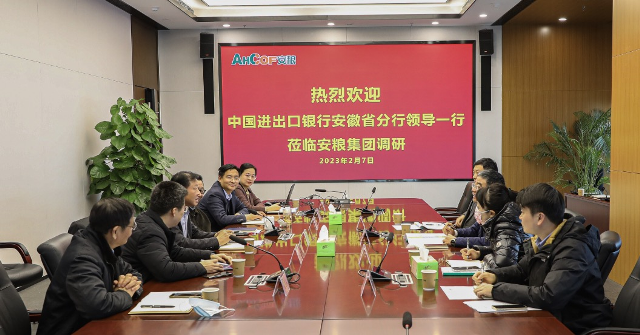 2023年2月7日,中國進出口銀行安徽省分行武建軍行長、王宇輝副行長等一行到公司調研。安糧集團、安糧控股公司領導曹訓立、周洪、楊榮山、程松林及相關部室負責人熱情接待了武行長一行并舉行座談。