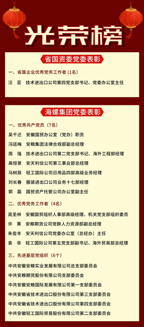 近日,省國資委黨委、海螺集團黨委分別開展了省屬企業(yè)和集團優(yōu)秀共產(chǎn)黨員、優(yōu)秀黨務工作者、先進基層黨組織表彰,安徽國貿(mào)所屬技術進出口公司汪蕓同志榮獲省屬企業(yè)優(yōu)秀黨務工作者稱號,吳千遷等7名同志榮獲集團優(yōu)秀共產(chǎn)黨員稱號,晁圣林等4名同志榮獲集團優(yōu)秀黨務工作者稱號,安糧實業(yè)公司黨總支等6個基層黨組織榮獲集團先進基層黨組織稱號。