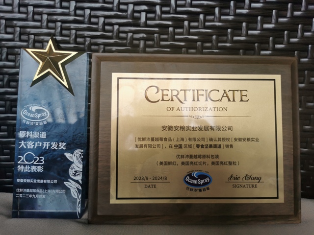 安糧實(shí)業(yè)獲得優(yōu)鮮沛品牌授權(quán),并榮獲“大客戶開發(fā)獎(jiǎng)”,不僅是對(duì)安糧實(shí)業(yè)在休閑食品原料領(lǐng)域?qū)I(yè)性的認(rèn)可,也是對(duì)我司市場(chǎng)開拓能力的信任。通過共享資源、互換優(yōu)勢(shì),安糧實(shí)業(yè)與優(yōu)鮮沛將共同推動(dòng)休閑食品行業(yè)的發(fā)展,為廣大消費(fèi)者帶來更多美味、健康的休閑食品,未來安糧實(shí)業(yè)與優(yōu)鮮沛的合作會(huì)讓更多客戶采購(gòu)到高品質(zhì)休閑食品原料和新鮮蔓越莓產(chǎn)品。