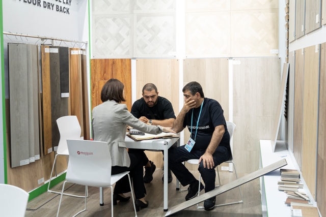 建材展位展品主要為室內(nèi)強化木地板、防水木地板、石塑SPC及WPC地板等。到訪客戶大多來自南美,也有部分中東、歐洲等國的新客戶。結(jié)合目標市場,業(yè)務(wù)部提前準備了最新流行的木紋拼花地板等產(chǎn)品,其獨特的款式和顏色吸引了眾多新老客戶駐足洽談。