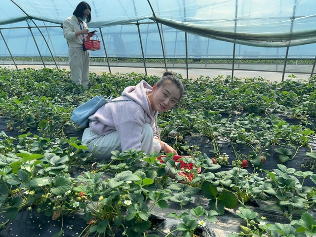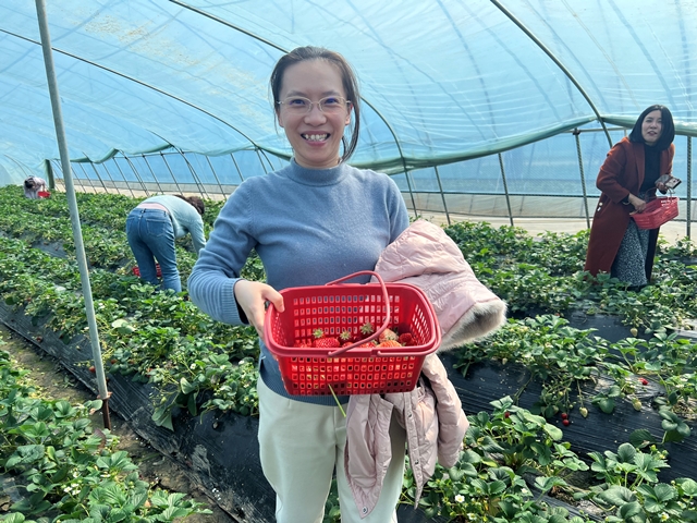 連片的草莓棚里,顆顆草莓飽滿、香甜,透著勃勃生機,甜蜜的香氣撲鼻而來。大家按捺不住興奮的心情,提著小框穿梭在草莓田間精挑細選,或駐足合影、或互相幫助,不一會兒,筐子里已是碩果累累,收獲的喜悅溢于言表。采摘的同時,果園負責人還為大家介紹了草莓品種、草莓的栽培方法和現(xiàn)代農(nóng)業(yè)發(fā)展狀況。
