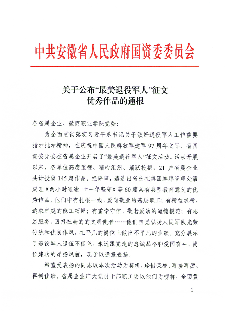 近日,安徽省國(guó)資委黨委通報(bào)了“最美退役軍人”征文活動(dòng)優(yōu)秀作品名單。安糧集團(tuán)選送的兩篇作品《退役不改本色 續(xù)寫奮斗篇章》《揮別軍涯 續(xù)寫華章》均獲評(píng)“優(yōu)秀作品”。
